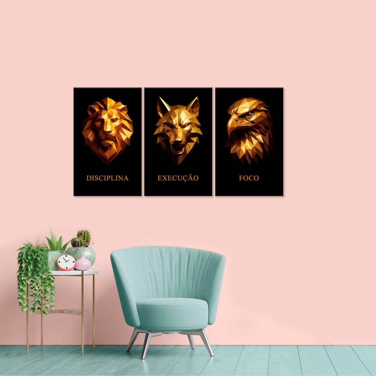 Esta obra apresenta três arquétipos ancestrais condensados em formas geométricas douradas, como se fossem esculpidos a partir da própria ideia de poder. O leão, o lobo e a águia não aparecem como animais, mas como símbolos lapidados — facetas de uma mesma força interior. O fundo negro absoluto elimina distrações e transforma cada figura em um ícone, quase um totem contemporâneo.