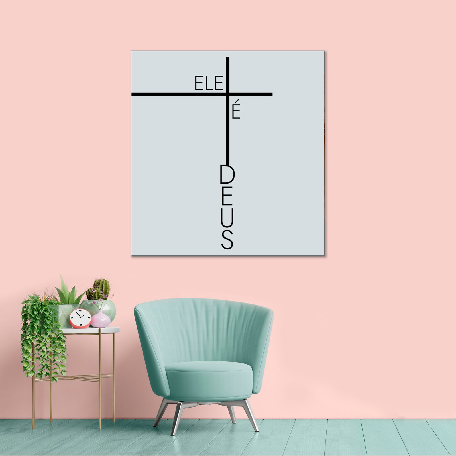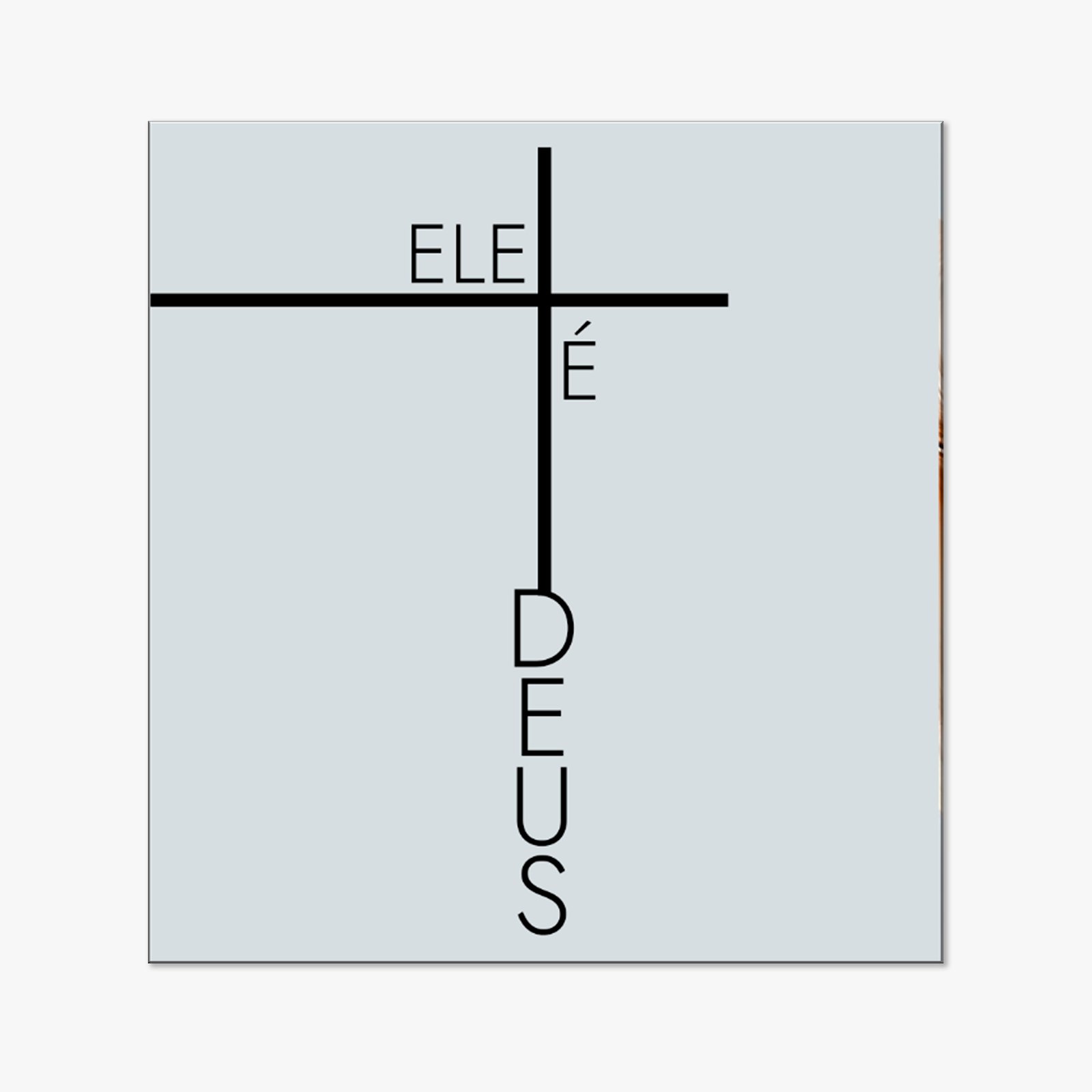 Esta obra se constrói a partir da economia extrema de elementos para tocar uma ideia absoluta. Linhas negras, firmes, cortam o espaço claro como um eixo de sentido, formando uma cruz que é ao mesmo tempo símbolo, estrutura e linguagem. As palavras “ELE” e “DEUS” não são apenas lidas — elas são atravessadas, interrompidas, sustentadas pela forma. O verbo “É” surge no encontro das linhas, no ponto exato onde tudo converge.